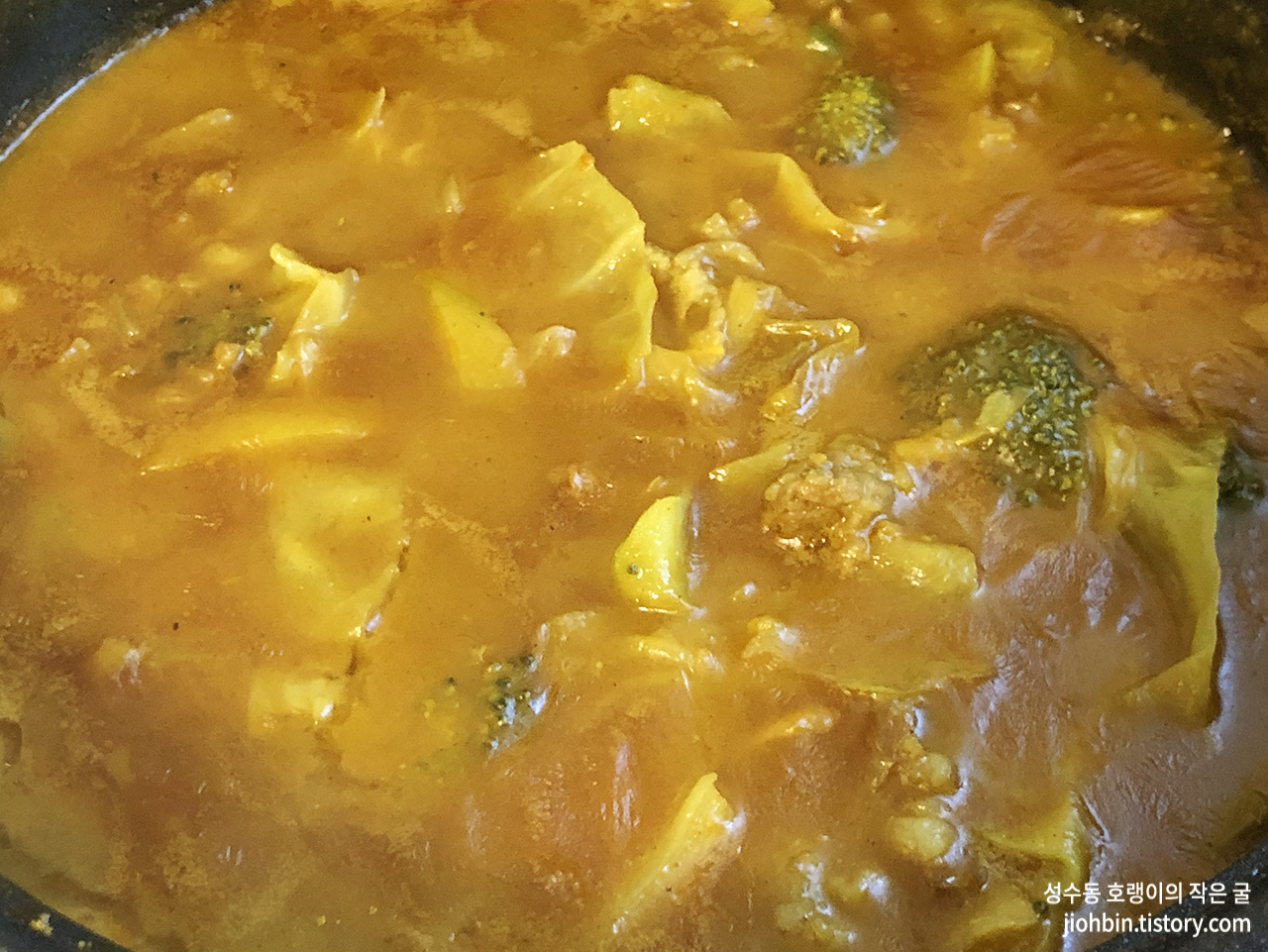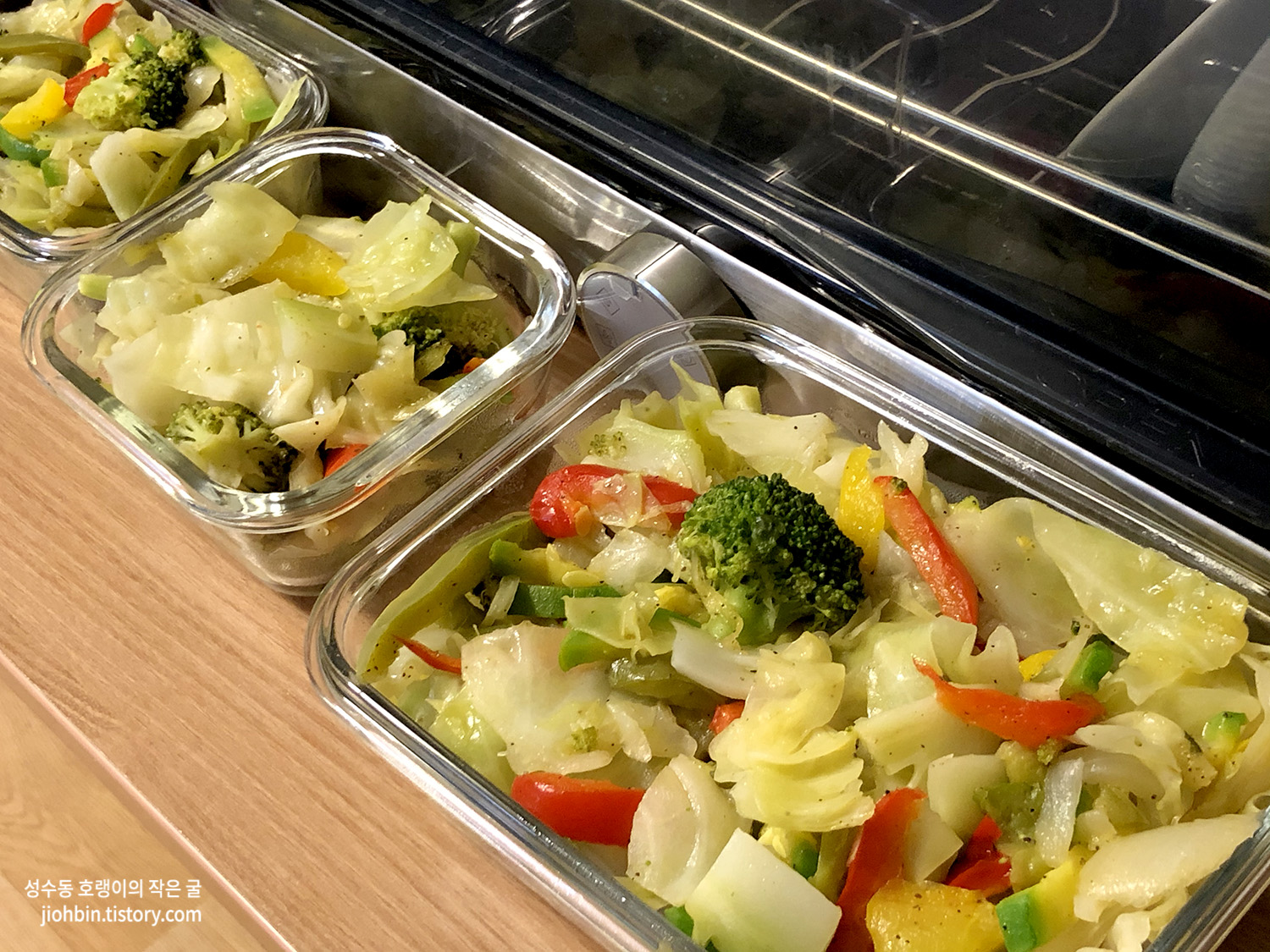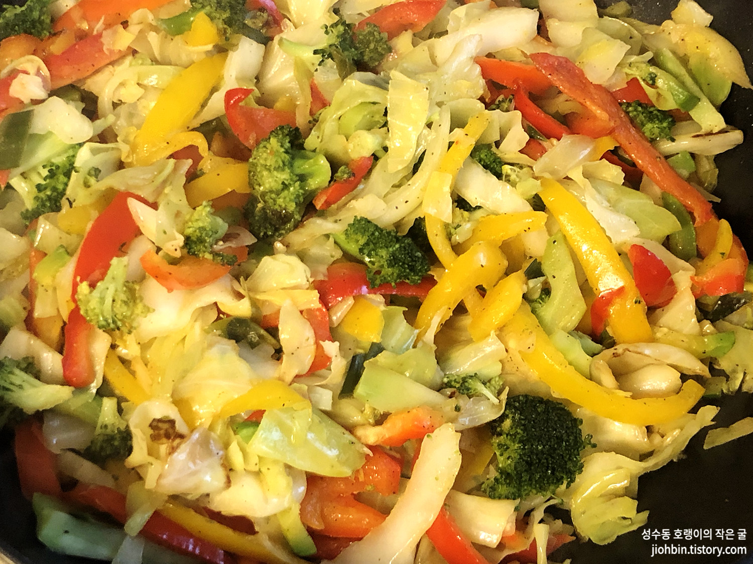 재료도 간단합니다. 그때그때 시즌에 맞는 저렴하고 싱싱한 제철 채소 여러 가지면 좋을 것 같습니다. 채소도 색깔별로 영양소와 효능이 다르다(파이토 케미컬)고 합니다. 영양도 좋고 이왕이면 보기에도 예쁘게, 다양한 색상의 채소를 넣어주면 좋을 것 같습니다. 저는 기본 베이스에는 주로 양배추를 애용합니다. 위에 좋은 건 기본이고, 섬유질도 풍부한 채소고요. 그 외에는 때에 맞춰 마트에서 저렴하게 판매되는 싱싱한 채소들로 재료를 채워 줍니다. 파프리카를 넣기도 하고, 가지, 쥬키니 호박, 시금치, 브로콜리, 피망, 깻잎, 배추 등등 그때그때 가성비 좋은 재료를 준비합니다.