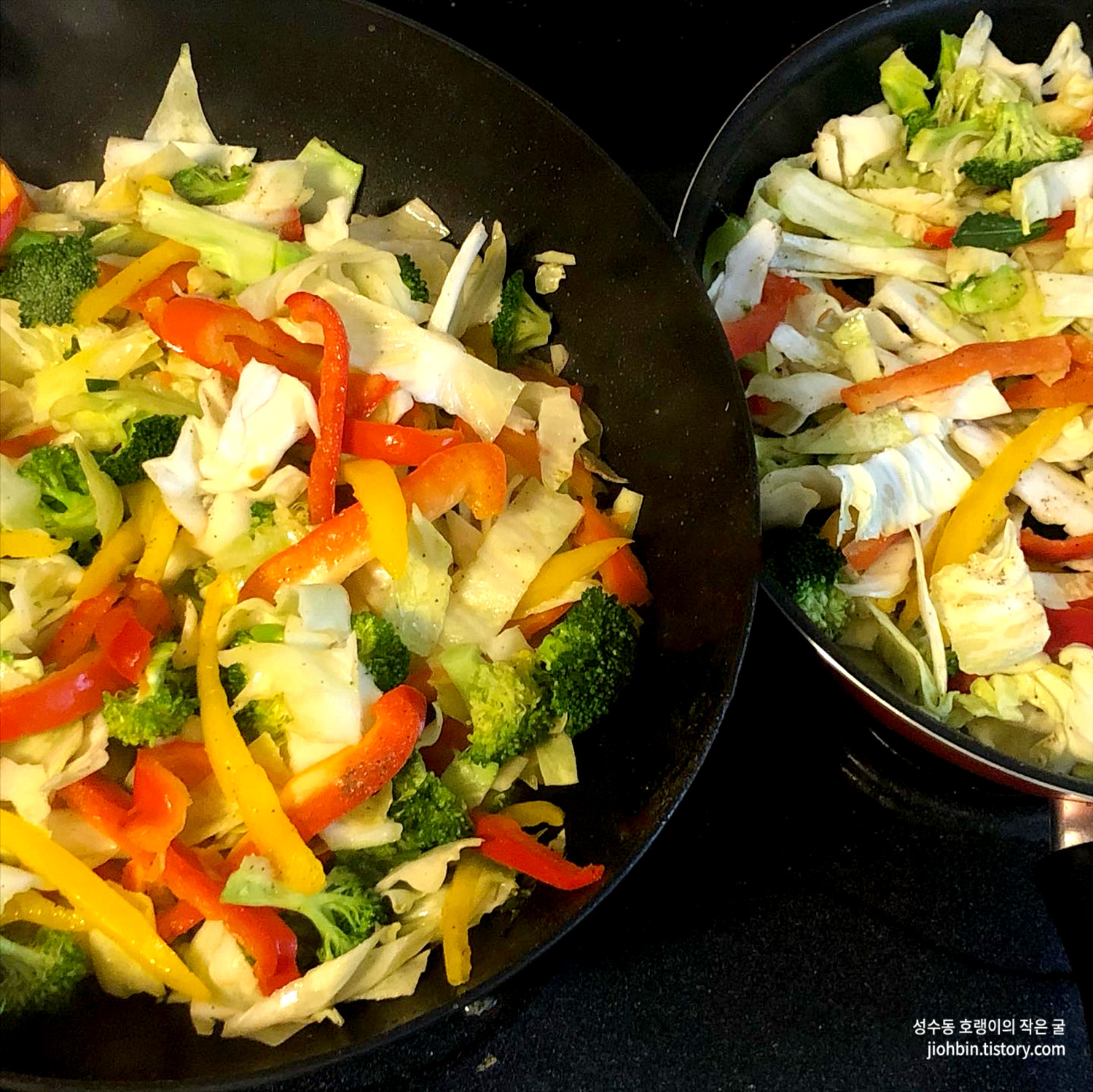 구매해온 채소들은 각각 씻어주고 한 젓가락에 들어 올렸을 때 먹기에 편할만한 크기로 썰어줍니다. 다 썰어 두었다면 재료 준비 끝. 저는 주로 중식요리 용으로 나온 넓고 깊은 웍을 사용합니다. 볶음 요리이기 때문에 엑스트라 버진 올리브 오일보다는 퓨어 올리브 오일을 활용합니다. 채소를 기름과 볶아주면 비타민과 다양한 지용성 영양소 섭취도 수월해지고 생 채소 섭취 시에 생길 수 있는 소화불량, 복통, 더부룩함 등 부작용은 확 줄일 수 있습니다.