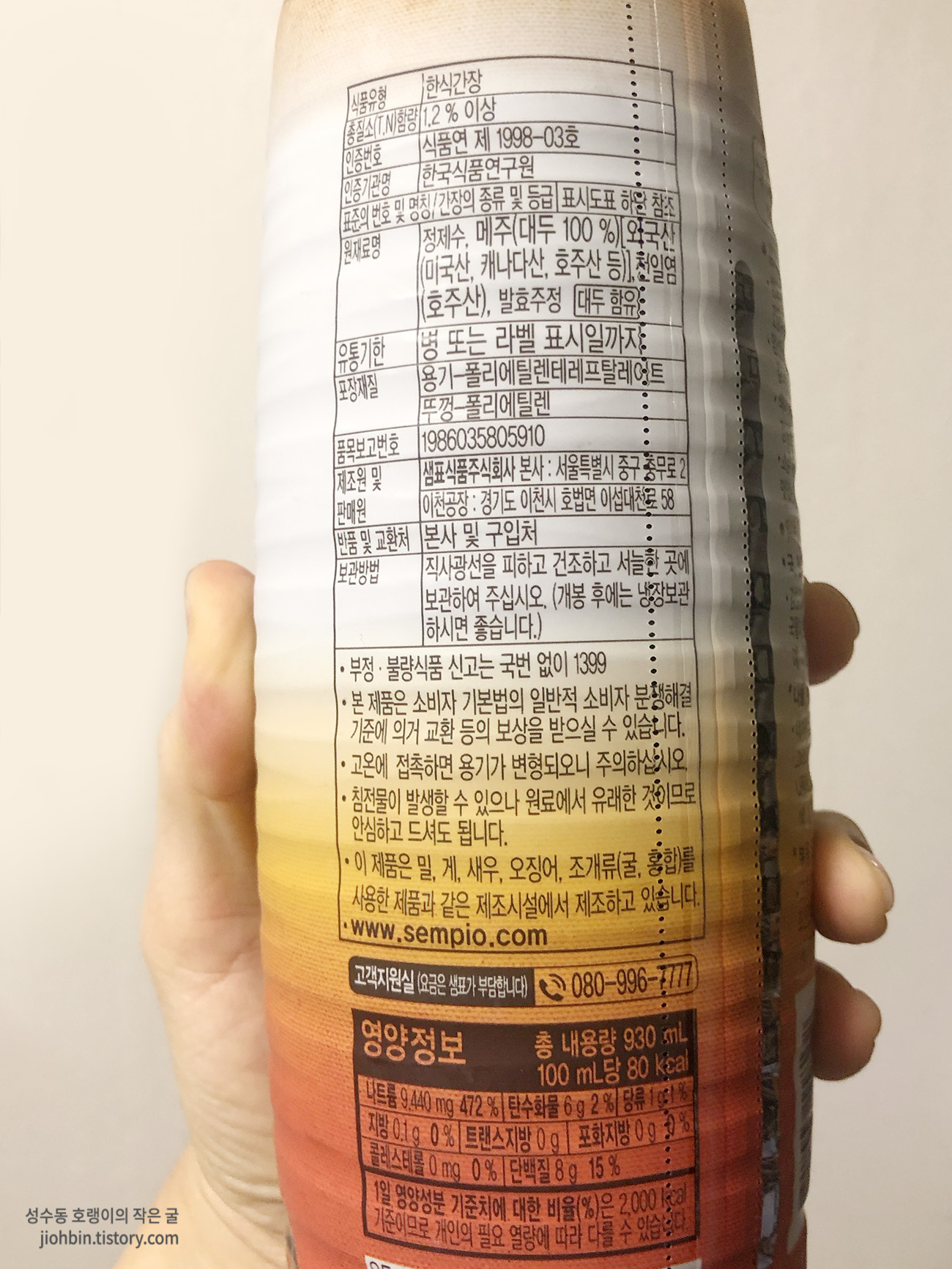 저는 저탄고지 식단을 시작하면서 제품 후면을 항상 보는 습관이 생겼습니다. 주로 보는 건 원재료명과 영양정보입니다. 이 제품을 보면 원재료는 정제수, 메주, 천일염, 발효주정. 끝입니다. 심플합니다. 원래 장에 가까울수록 이런저런 첨가물이 들어가지 않습니다.