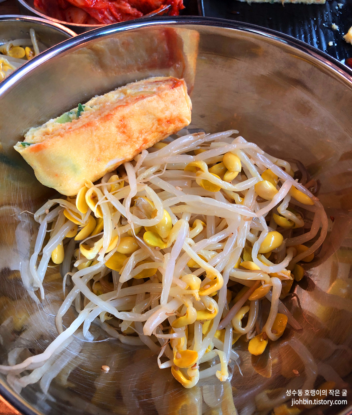 마지막으로는 부대찌개. 세 가지 메뉴 중에 제일 추천하지 않는 방법입니다만 ㅎㅎㅎ 회사에서 어쩔 수 없이 단체로 갔을 때 사용했던 방법입니다. 저희는 주로 이태리 부대찌개를 갔었습니다. 주문을 하면 큰 대접에 밥을 듬뿍 주시는데 이때 저는 밥 안 주셔도 괜찮습니다~ 말씀드리고 받지 않아도 되고요. 혹시 밥을 받았다면 받자마자 셀프바로 들고 가서 밥솥에 다시 밥을 넣어놓으면 됩니다. 그리고 그 그릇에 반찬용 셀프바에 있는 콩나물을 먹을 만큼 담아옵니다. 콩나물 대가리에도 탄 수가 있긴 하지만, 밥보다는 낫습니다.
