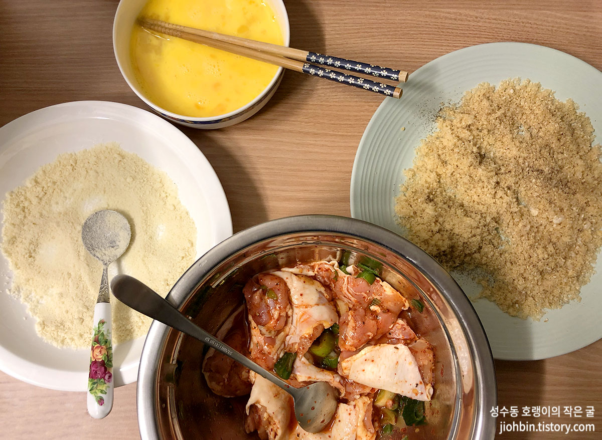 사진이 생략되었지만 튀김옷을 준비하기 전에 생 닭고기에 밑간을 먼저 해주면 좋습니다. 재워둘 시간도 필요하고 말이죠. 저는 먹기에도, 만들기도 편하게 닭다리 순살을 준비했습니다. 뼈가 있으면 익히는 게 어려워서 순살이 좋았습니다. 좋아하는 닭고기 부위를 원하는 크기로 잘라 소주, 대파, 소금, 후추, 에리스리톨 약간, 고춧가루를 넣어 밑간 해 줬습니다. 시중에 판매되는 핫 스파이시 같은 맛을 원해서 고운 청양 고춧가루도 섞어서 재워 두었습니다.