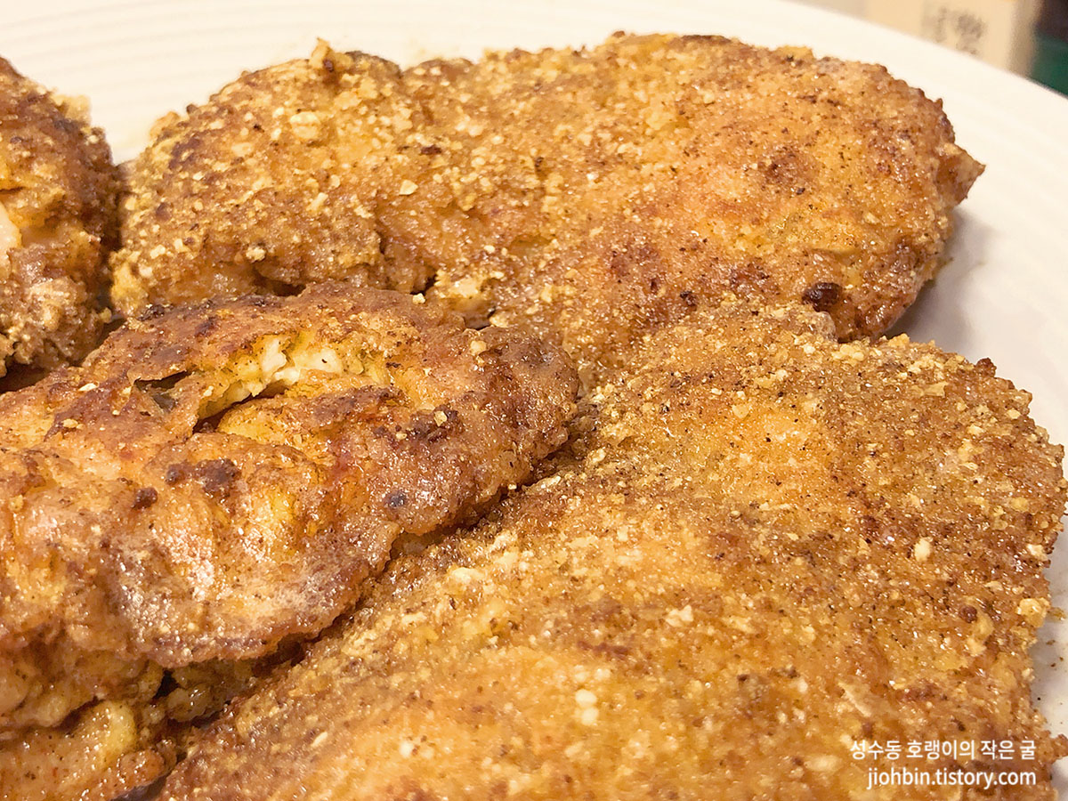 너무 세지 않은 온도로 앞뒤로 골고루 익혀주며 구워냈습니다. 저는 이때 큰 덩어리를 그냥 사용했지만, 보통 순살치킨처럼 작게 잘라서 하는 게 훨씬 좋은 것 같습니다. (다 만들고 밀려오는 후회....) 밀가루처럼 딱 붙는 튀김옷이 아니다 보니 썰어먹기에 불편하더라고요. ㅎㅎ