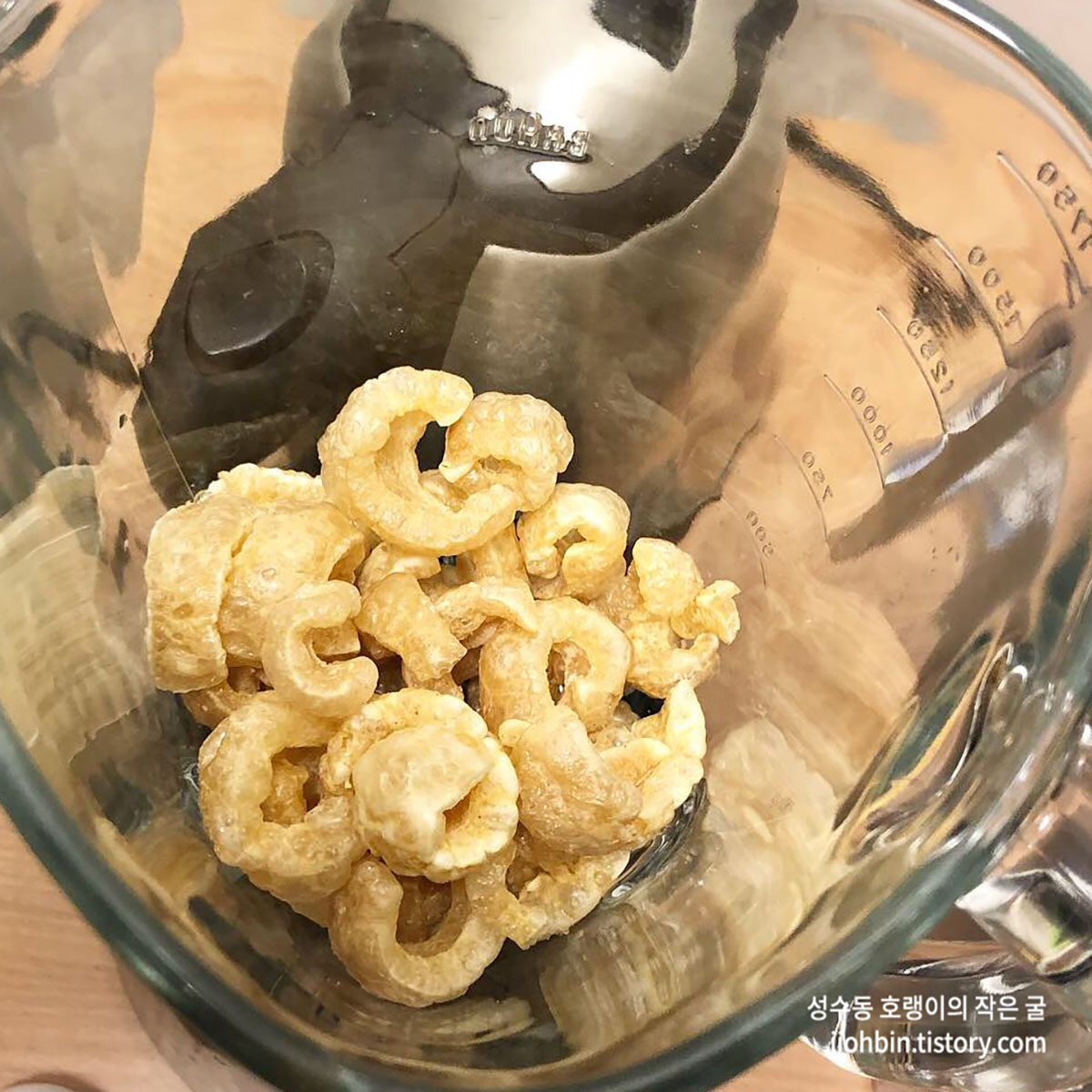 앞서 포스팅했던 돼지 껍데기 과자를 믹서기에 부어 줍니다. 정말 바샤샥한 식감이라고 생각하시면 좋습니다. 하지만 일반 과자에 비하면 단단한 편이기 때문에, 비닐봉지에 넣어 부시게 되면 잘게 부수는 게 어려울 것 같아 믹서기를 이용해 줍니다.