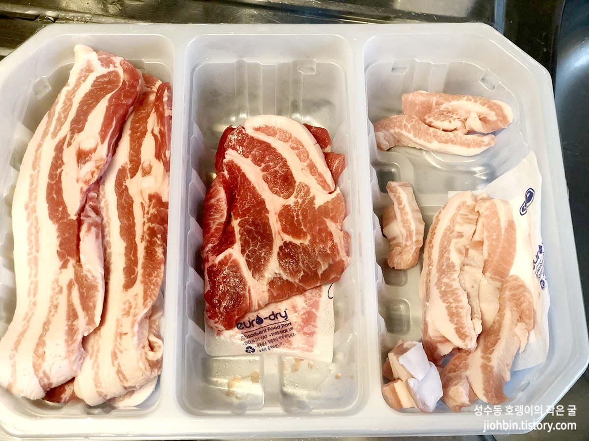 저는 사실 목심(목살)은 그렇게 선호하는 편이 아닙니다. 항정이나 삼겹살에 비해서 기름이 적어 저탄고지 식단에 딱 부합하지는 않고, 잘못사면 퍽퍽한 경우가 많기 때문입니다. 하지만 이 이마트 BBQ 바비큐 모둠에 포함된 목살은 눈으로 보기에도 선도가 아주 좋고 지방이 적당해서 부드러워 보입니다. 나머지 항정살이나 삼겹은 기름이 아주 많아서 마음에 쏙 듭니다. 특히 항정살은 오랜만에 먹을 생각에 아주 흡족합니다. (사진에서 항정살과 목살은 조리용으로 옮겨 담은 후입니다.)