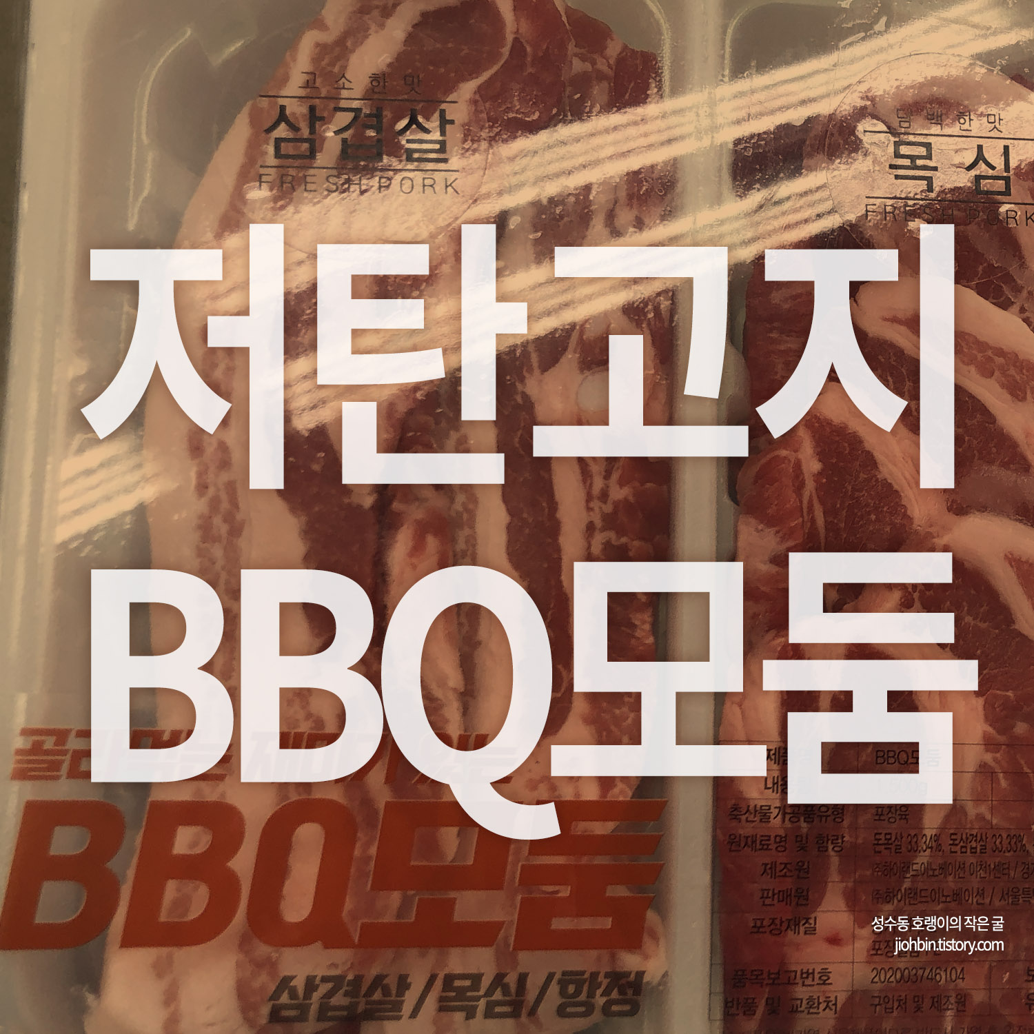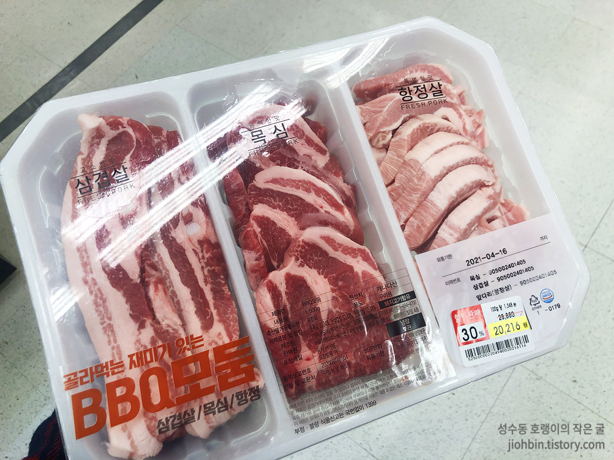 오늘 데려온 고기(!!)는 이 녀석입니다. 마트를 일주일에 못해도 3~4번 가다 보니 자주 눈에 보이긴 했지만, 키토식에서는 주로 삼겹살만 사는 주의다 보니 한 번도 집어온 적이 없었습니다. 그런데 이번에 때마침! 추가 마감 할인이 붙은 상태로 누워있는 이마트 BBQ 바비큐 모둠! 한눈에 보이다시피 삼겹살, 목살(목심), 항정살 3가지로 구성되어 있습니다.