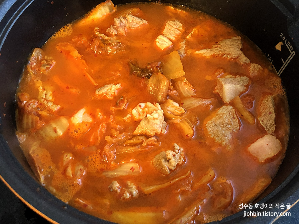 우선 기름기가 가장 적은 '목살'은 퓨어 올리브 오일과 함께 김치를 넣고 기름기름하게 볶아준 뒤 김치찌개로 거듭납니다. 때마침 집에 잘 익은 배추김치가 많아서 아주 맛있게 끓여졌습니다. 김치찌개는 먹어도 먹어도 질리지가 않고, 한번 끓여두면 다음 끼니 때는 더 맛있어지기까지 하니 아주 좋은 메뉴입니다. 이마트 BBQ 바비큐 모둠에 포함된 목살로 2인 기준 2번 먹을 고기가 듬뿍 들어간 김치찌개를 2번 끓여먹을 수 있을 것 같습니다. 총 8인분 정도의 '고기 듬뿍' 김치찌개 생산이 가능한 고기 양입니다. 하하~ 키토식단에서도 푹 익은 김치로 끓인 김치찌개는 나쁘지 않습니다. 다만! 설탕은 절대 금지! 찌개에 단맛을 내고 싶다면 스테비아나 에리스리톨, 알룰로스 같은 첨가물로 주의해서 대체해 주어야 합니다.