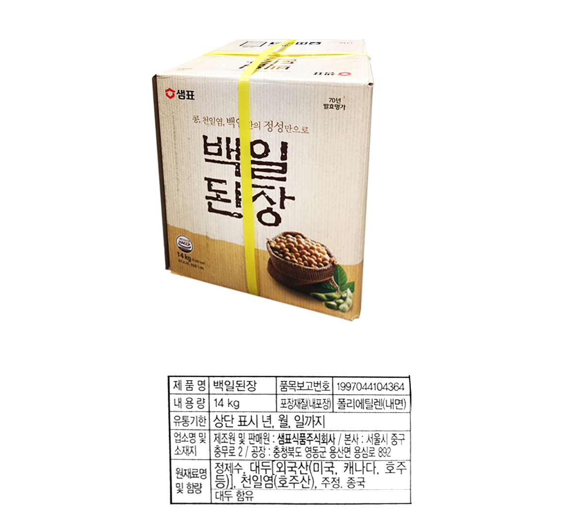 이번에도 빠질 수 없는 후면 정보! 네, 이쯤되면 후면 정보 덕후 맞습니다. 후면에도 제품명인 샘표 백일 된장 이름과 제품 소개 카피 '콩, 천일염, 백일간의 정성만으로'라는 문구가 적혀있습니다. 과연 사실인지 내용물 원재료명 및 함량을 확인해 봅니다. [정제수, 대두, 천일염, 주정, 종국] 네~ 소개글과 같이 정말 순수한 된장입니다. 이정도면 어른들이 말씀하시던 집된장입니다.