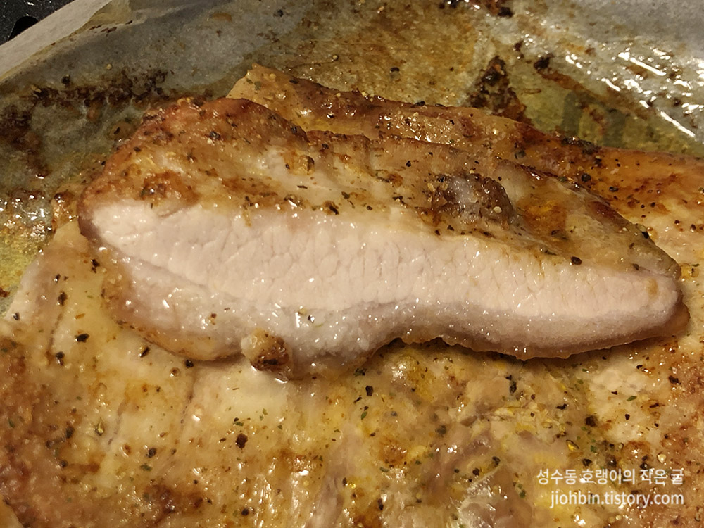 통 항정살을 약 400~500그램 정도 넣어주고 허브솔트로 밑간 해 주었습니다. 위에 보았던 1kg 패키지의 반 정도만 사용했습니다. 왠지 바비큐 기분을 내고 싶어서 시즈닝을 써봤습니다. 아메리칸 스테이크 시즈닝을 뿌려볼까 하다가, 우선은 향이 조금 약한 허브솔트 매콤한 맛을 뿌려줬습니다.