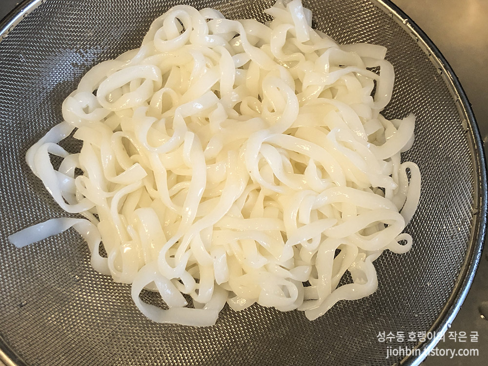 곤약면은 물에 담겨 비닐 포장되어 있습니다. 이 포장을 뜯고 채에 받쳐 안에 든 물을 따라버려 줍니다. 그리고 남은 면을 흐르는 물에 구석구석 씻어줍니다. 드셔 본 분들은 아시겠지만 곤약제품 특유의 향이 있습니다. 이 제품도 강하진 않지만 향이 남아 있습니다. 흐르는 물에 씻어주면 곤약 특유의 향도 좀 씻어내줄 수 있습니다.