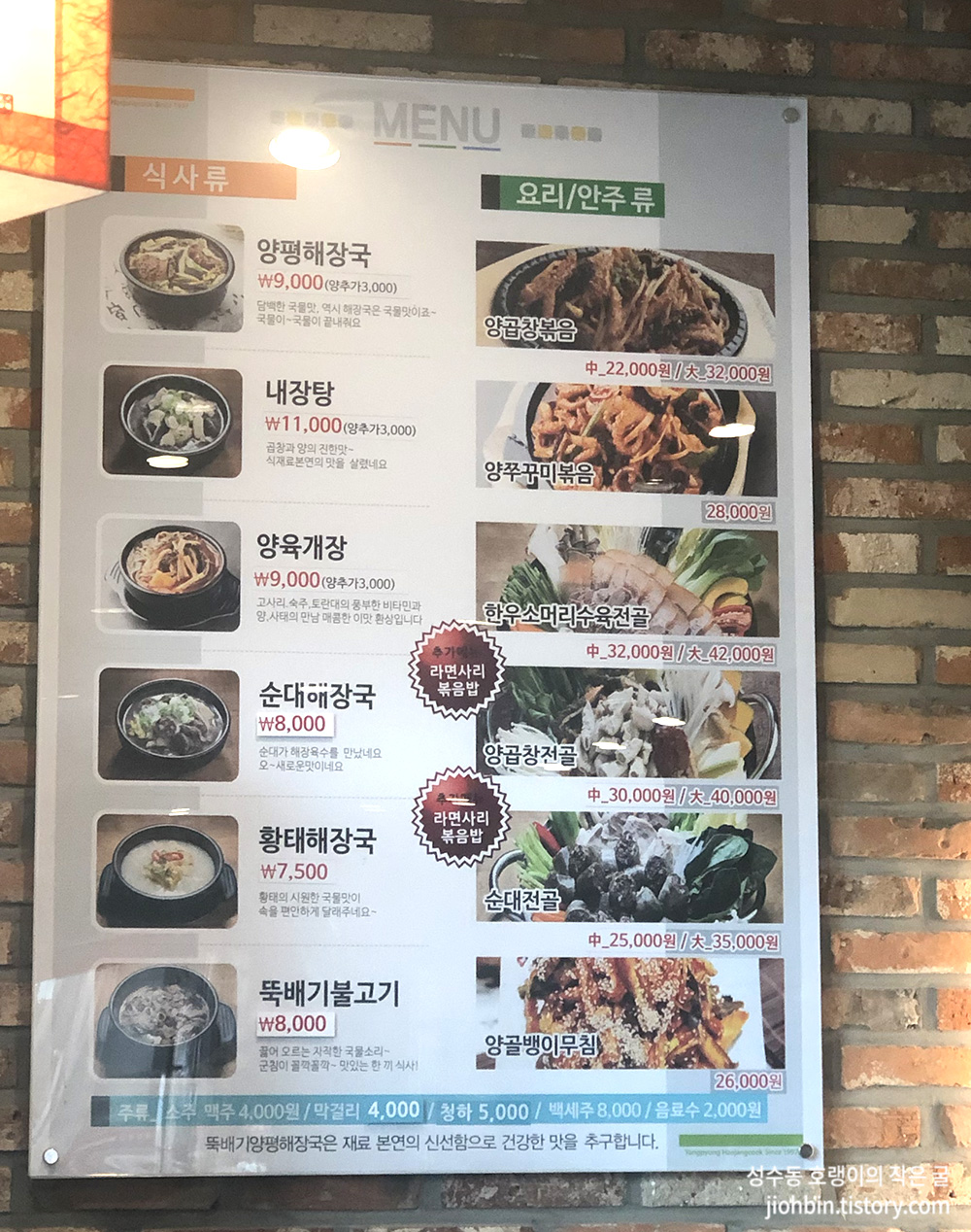 우선 메뉴는 이렇게 나눠져 있습니다. 식사류, 요리/안주류로 나누어져 있습니다. 전에 짝꿍과 양곱창 전골도 먹어봤는데 역시나 잡내 없이 맛있었습니다. 저는 주로 양평 해장국을 먹습니다. 내장탕도 종종 먹습니다. 둘다 아주 맛이 좋습니다. 식사메뉴 중에 저탄고지 식단으로 조금 불안한 메뉴를 꼽자면, 당면 순대가 들어간 순대 해장국과 달달한 뚝배기 불고기는 멀리하는 게 좋을 것 같습니다. 나머지 식사메뉴는 공깃밥만 제외하고 먹으면 저탄고지 식단으로 나쁘지 않을 것 같습니다!