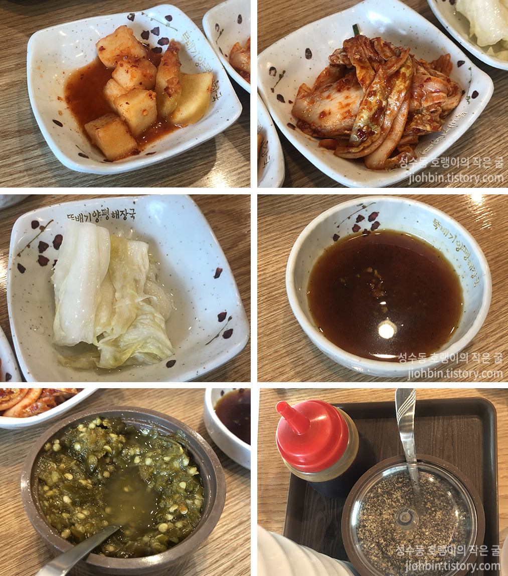 주문을 마치고 공깃밥과 반찬들을 서빙해 주십니다. 저는 공깃밥을 빼 달라고 말씀드렸습니다. 반찬은 깍두기, 김치, 백김치, 선지와 내장을 찍어먹는 장을 주십니다. 백김치가 정말 시원하고 맛있습니다. 깍두기나 배추김치도 맛있지만 식당김치다보니 설탕도 들어가고 그랬을것 같네요. 하하. 그리고 별도로 다진 고추지를 주시는데 새콤 매콤하니 맛있습니다. 국물에 타서 먹으면 한층 더 시원해지는 것 같습니다. 그리고 양평 해장국집이다 보니, 테이블 한쪽에 고추기름과 들깨가루가 있습니다. 저는 맑게 먹는 걸 좋아하는 취향이라 따로 넣진 않고 먹었습니다.