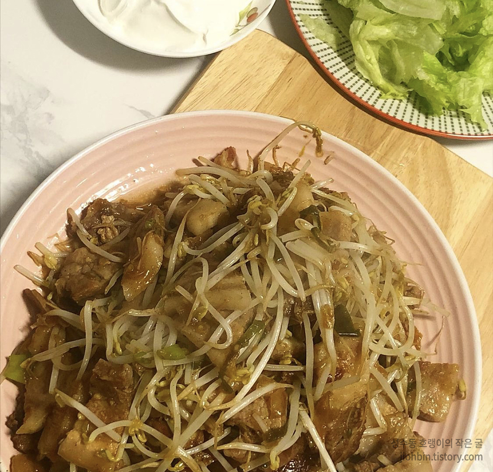 숙주나물은 탕에 넣어도 좋지만 고기와 볶아 먹으면 더 맛있는 것 같습니다. 저는 소고기로 불고기를 만들 때도 넣어 먹습니다. 소고기 불고기감으로 얇게 썰어놓은 부위를 사다가 포스팅한 적 있던 조선간장과 물, 알룰로스 또는 스테비아나 에리스리톨을 넣어 양념해줍니다. 양파 또는 대파를 넣어주면 좋습니다. 마늘을 넣으면 풍미가 더 좋지만, 저탄고지 식단에서는 자제하는 게 좋습니다. 양념에 재운 고기와 대파를 볶아주다가 다 익어 마무리되어 갈 때쯤 숙주나물을 넣어 센 불에 한번 더 볶아 줬습니다. 이렇게 한 접시 그득 먹으면 밥 없이도 든든하고 아주 좋습니다. 저는 양상추와 사워크림을 곁들여 먹었습니다.