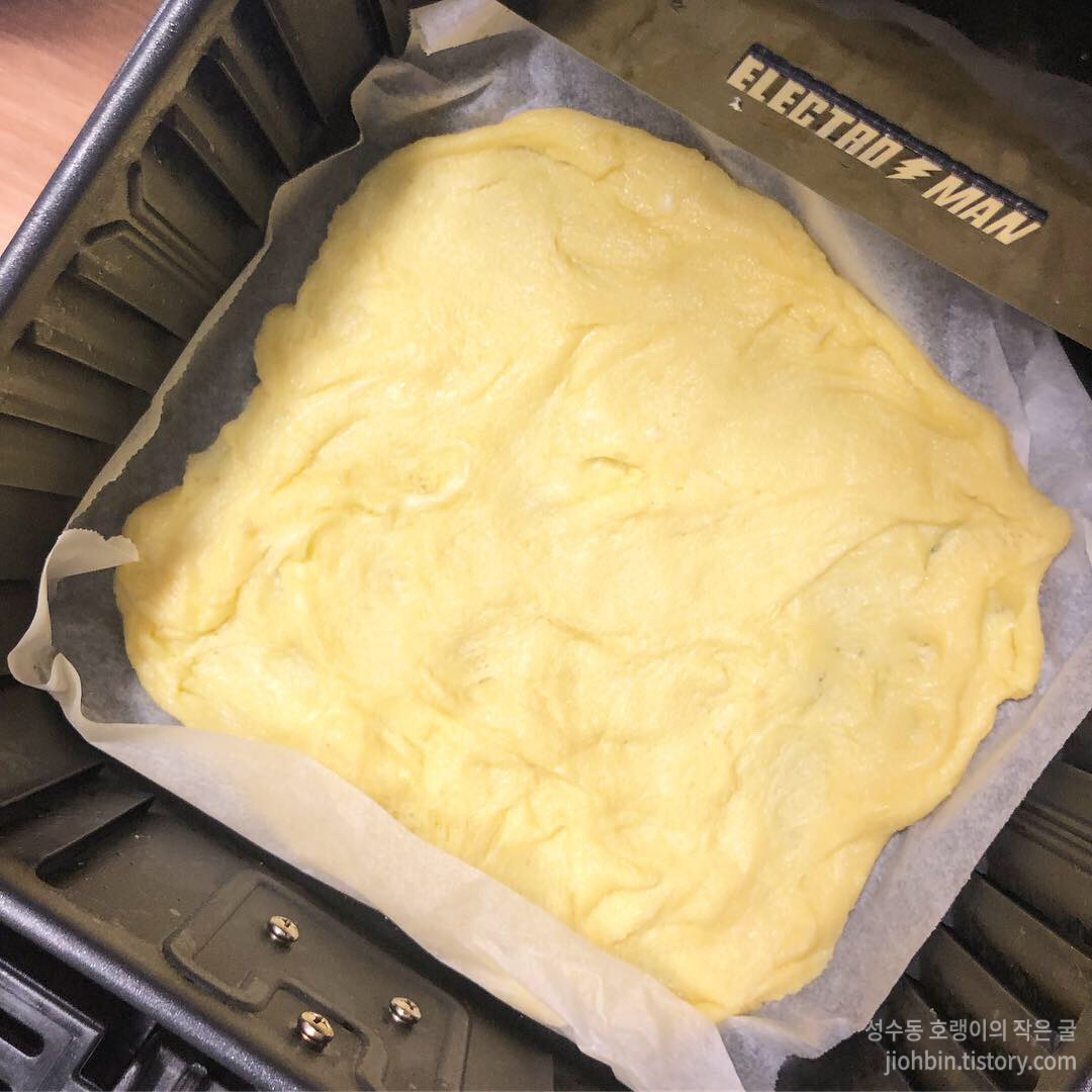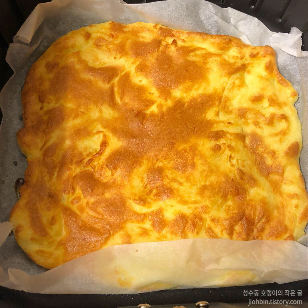 준비된 반죽을 종이 포일을 세팅해둔 에어프라이어에 모양대로 넓게 펴서 한번 구워줍니다. 180도에서 8분 정도 구워보고 모자라면 시간을 추가해서 구웠습니다. 오래 두고 먹을 계획 일 경우 종이 포일에 덜어 얇게 펴고, 윗면에도 종이 포일을 부착하고 냄새가 들어가지 않게 지퍼백에 담아 냉동실에 보관하면 됩니다. 바로 구워 피자를 만들 경우 한쪽면의 색만 먹음직스럽게 나도 좋습니다. 익은 도우는 다시 뒤집어서 이제 피자로 세팅을 해 줍니다.