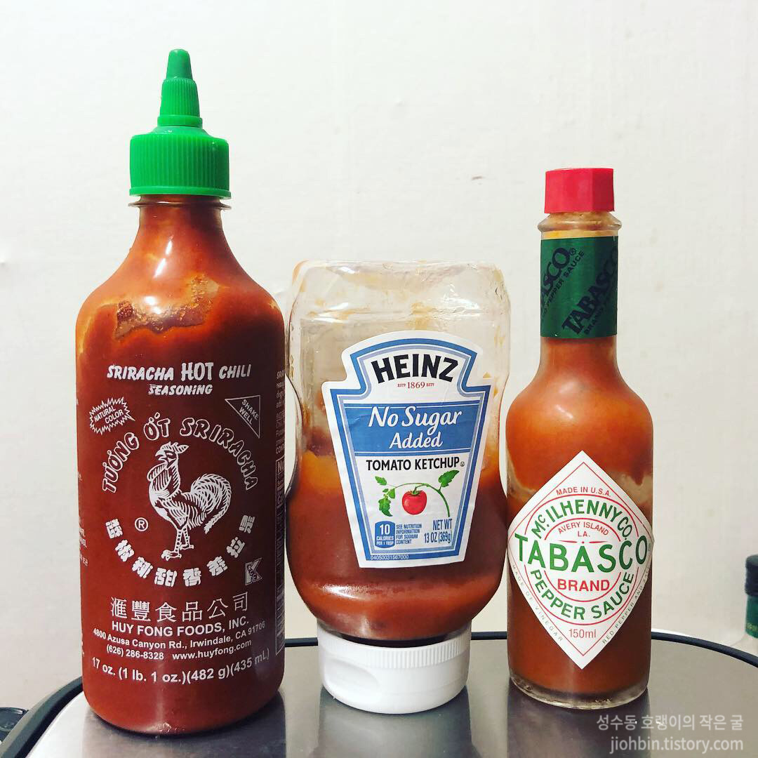 저는 이렇게 세 가지 소스를 섞어서 피자 소스를 만들어 줬습니다. 다이어트계의 소스 대장 스리라차와 하인즈 무설탕 케첩, 피자 친구 핫소스입니다. 세가지만 잘 섞어도 시판 피자 부럽지 않은 소스가 만들어집니다. 하인즈 무설탕 케첩은 사람에 따라 첨가물 때문에 드시지 않는 분들도 계시지만 저는 가끔은 허용하는 편입니다. 이 부분도 나중에 케첩 편을 만들어 다뤄볼까 합니다. 비율은 각자 좋아하는 대로 섞어주면 될 것 같습니다. 스리라차는 매운맛, 케첩은 익히 아는 케첩 맛, 핫소느는 새콤 매콤한 맛입니다.