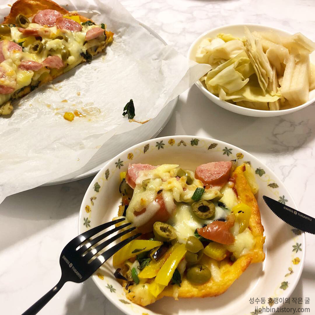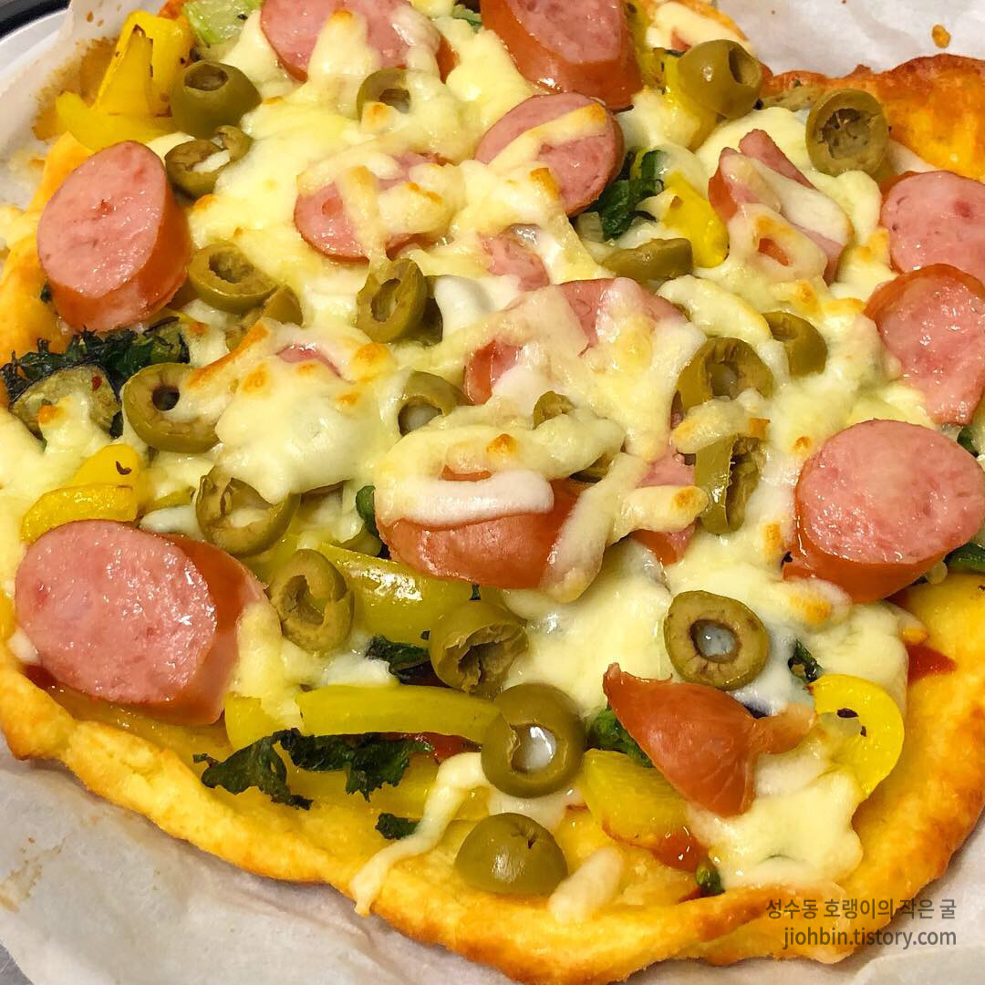 피자의 핵심은 치즈와 소시지입니다. 마트에서 후면 성분 열심히 보고 찾아낸 소시지를 뿌려둔 채소 토핑 위에 골고루 썰어 넣어주고집에 있는 올리브도 올려 주었습니다. 피자치즈를 듬뿍 뿌려 에어프라이어에 익혀주었습니다. 보기에도 정말 피자스럽죠? 하하. 맛도 사실 진짜 피자와 엄청 차이 나진 않습니다. 밀가루가 주는 고소함이 조금 부족하긴 하지만, 이런 음식을 먹으면서 다이어트가 가능함에 놀랍고 감사합니다.