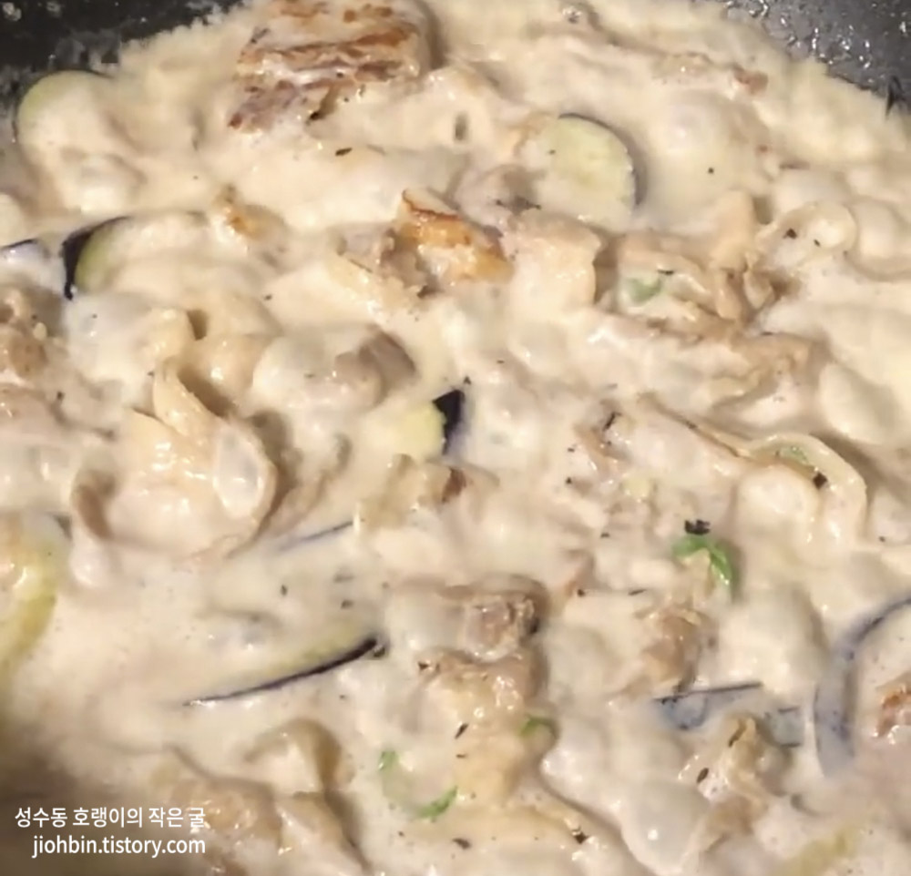 크림 삼겹은 말그래도 크림소스에 삼겹살에 파스타 면 대신 삼겹살을 넣어 먹는 음식입니다. 원래도 크림 파스타에도 베이컨을 듬뿍 넣기도 하니 아주 말 못 할 조합은 아니라고 생각합니다. 하하. 저는 아예 면 없이 먹었지만, 두부면을 넣어 정말 파스타처럼 만들어 먹어도 좋습니다. 쌀쌀한 날씨에 만들어 먹으면 속부터 든든 뜨끈뜨끈해지는 요리입니다.