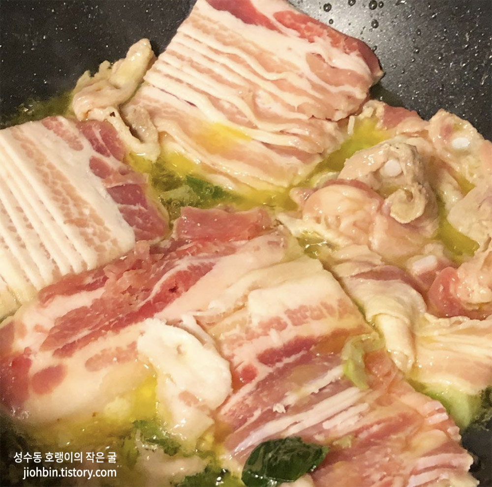 우선 처음에는 팬에 올리브 오일과 버터에 대파를 넣어 볶아 줍니다. 대파의 향은 모든 음식의 맛을 높여주는 것 같습니다. 파 기름을 낸 후, 대패 삼겹살을 넣어 어느 정도 익혀줍니다. 저는 대패 삼겹살 500g을 넣었지만 상황에 따라 우삼겹이나 돼지고기 앞다리살, 소고기 등으로 대체해도 좋을 것 같습니다. 소고기 안심으로 해도 아주 맛있고 고급스러울 것 같습니다.