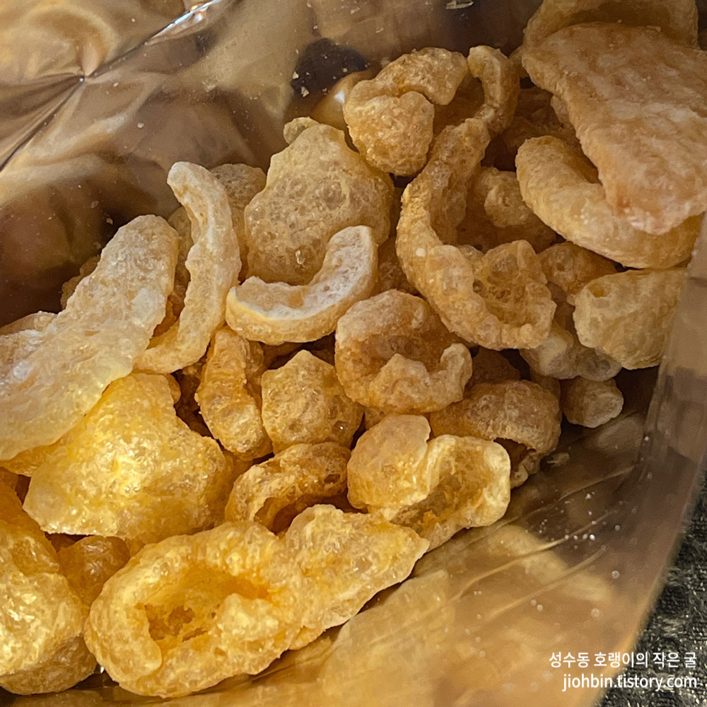 다만 원재료들은 지난번 소개해 드린 제품에 비해, 간단하지만은 않습니다. 일단 돼지껍데기 펠렛에 가미된 첨가물들이 많은 것 같습니다. 그리고 껍데기를 튀겨낸 기름이 순수 돼지기름인 라드유가 아닌 팜올레인유.. 식물성 정제된 기름이라는게 마음에 좀 걸립니다. 100% 순수 클린하진 않지만, 그래도 편하게 바삭한 돼지껍데기 스낵을 즐길 수 있으므로 이정도는 넘어가 보기로 합니다. 클린하다고 할 수는 없고, 약간 더티키토에 가까운 느낌이겠죠.