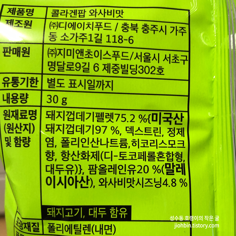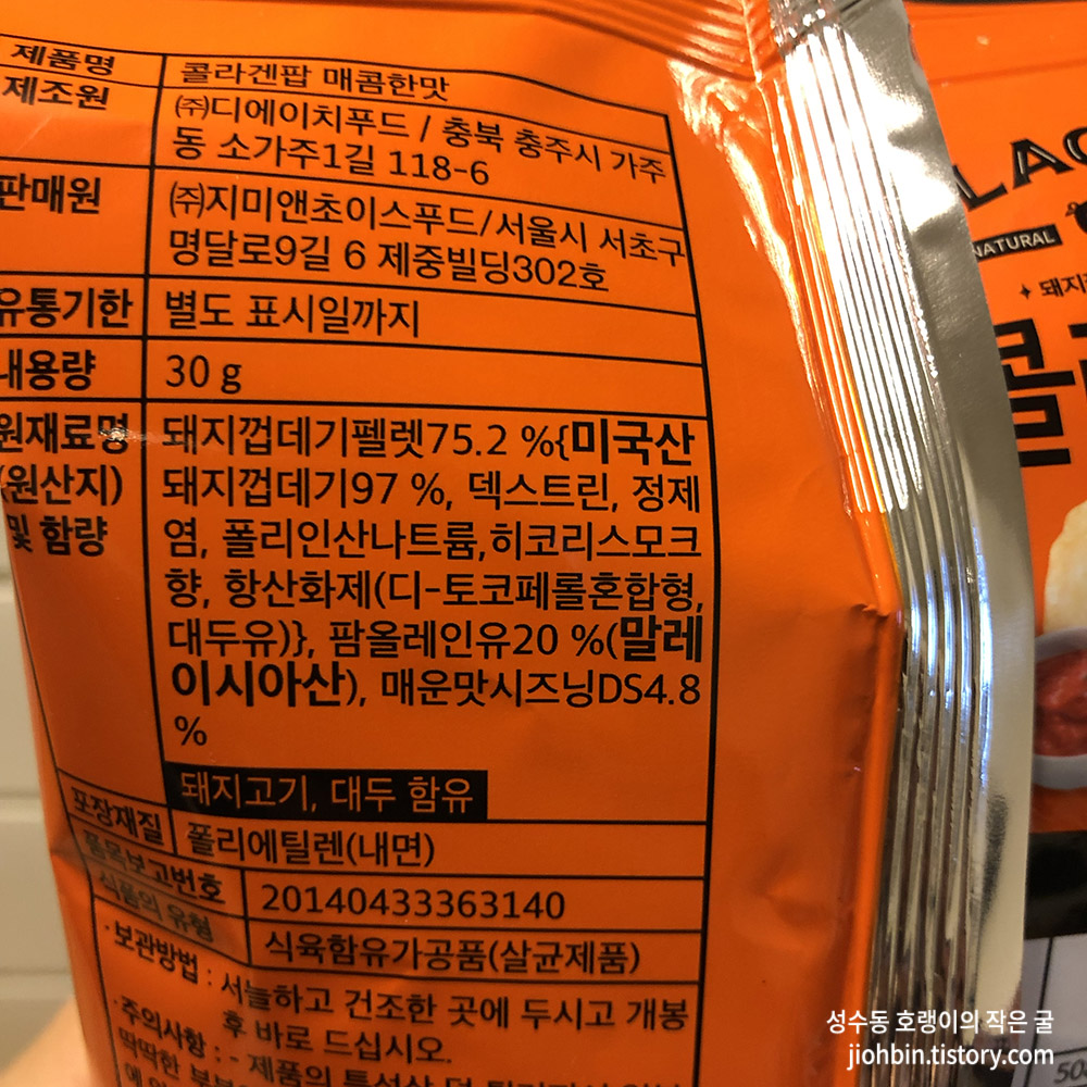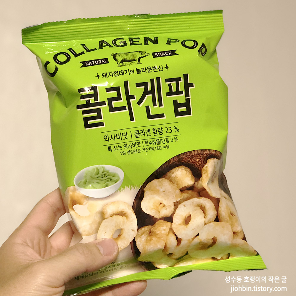 전에도 돼지껍데기 과자 치차론을 한번 올렸던 적이 있는데요. 이번에는 조금 다른 제품을 가지고 왔습니다. 돼지껍데기 자체를 돼지기름에 튀긴 순수한 돼지 껍데기에 가까웠던 지난 제품과 달리, 이번 글에 소개해 드릴 제품은 와사비 시즈닝, 매운맛 시즈닝이 첨가된 조금 더 보편적인 맛의 돼지 껍데기 과자입니다. 아무 시즈닝이 첨가되지 않았던 지난 제품은 호불호가 극명한 제품이었던데 비해, 오늘 정리해보는 이 제품, '콜라겐팝'은 호불호가 크지않고 대중적으로도 좋아할만한 스낵이지 않을까 싶습니다.