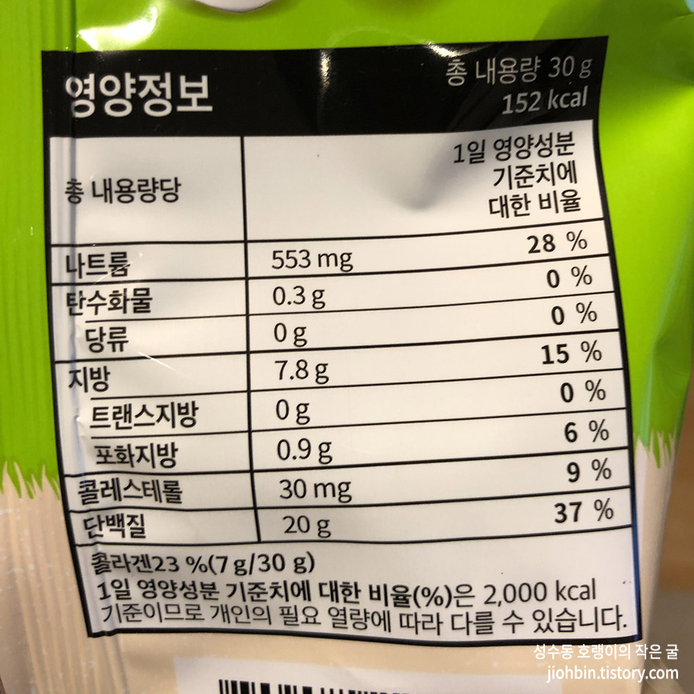 다음으로는 와사비맛의 콜라겐팝입니다. 용량은 동일하게 30g, 152kcal입니다. 역시 전면에 탄수화물 / 당류 0%를 자랑스럽게 명시해 두고 있습니다. 개인적으로 고추냉이를 정말 좋아해서 매콤한 맛 보다 더 기대되는 제품입니다.