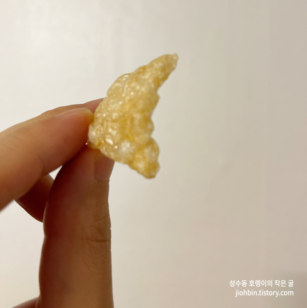 봉투를 열어 내용물을 살펴봅니다. 골고루 잘 튀겨진 돼지껍데기들이 보입니다. 역시나 예상처럼 양은 많지 않습니다. 잘 튀겨진 뻥튀기 같은 모습도 보입니다. 저는 기대감이 더 높았던 와사비 맛 부터 뜯어봤습니다. 와사비 시즈닝 덕분인지 돼지 껍데기 과자 치차론 특유의 돼지 냄새가 많이 나진 않는것 같습니다. 살짝 와사비향이 나면서 맛이 더 궁금해 졌습니다.