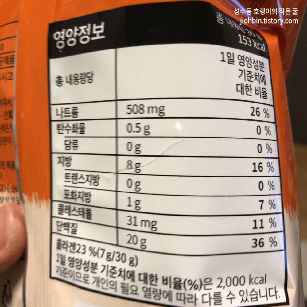 우선 매콤한맛의 콜라겐 팝 입니다. 제가 구매한 용량은 30g으로 사실 정말 조금 들어있습니다. 일반 과자에 비해서는 역시 가격은 조금 더 있는 편입니다. 30g에 153kcal라고 합니다만 키토식에서는 칼로리는 사실 그다지 중요하지 않습니다. 우리에게 중요한건 탄수화물 함량과 당의 함량이니까요. 그래서인지 제품의 이름 아래에 큼지막하게 적혀있습니다. 탄수화물/당류 0%라고 말이죠.