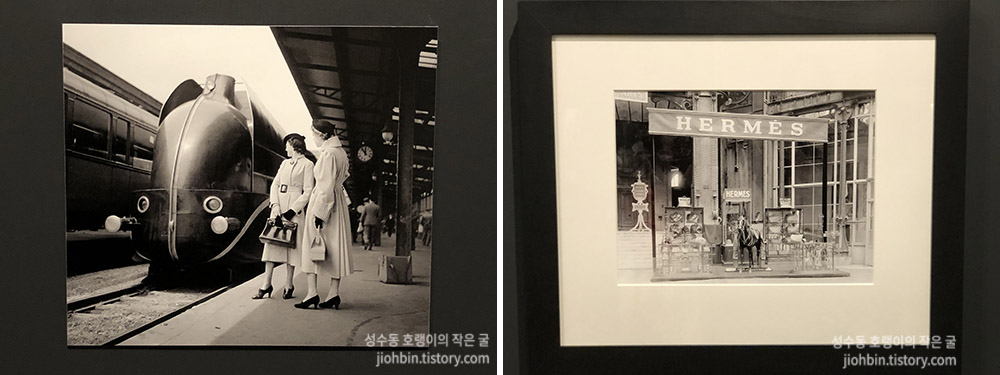 다음 섹션으로 넘어가기 전에 만난 에르메스의 헤리티지가 느껴지는 사진들입니다. 좌측 사진은 작은 트렁크 케이스와 큰 여행용 가방을 든 두 여성으로 1973년에 보리스 리프니츠가 촬영한 사진이라고 합니다. 우측 사진은 1924년에 촬영한 파리 펫 박람회의 에르메스 전시 부스 전경이라고 합니다. 에르메스의 상징인 말 조형물이 가운데 있고 다양한 백들이 전시되어 있는 모습입니다. 요즘의 화보보다 더 멋스럽게 느껴집니다.