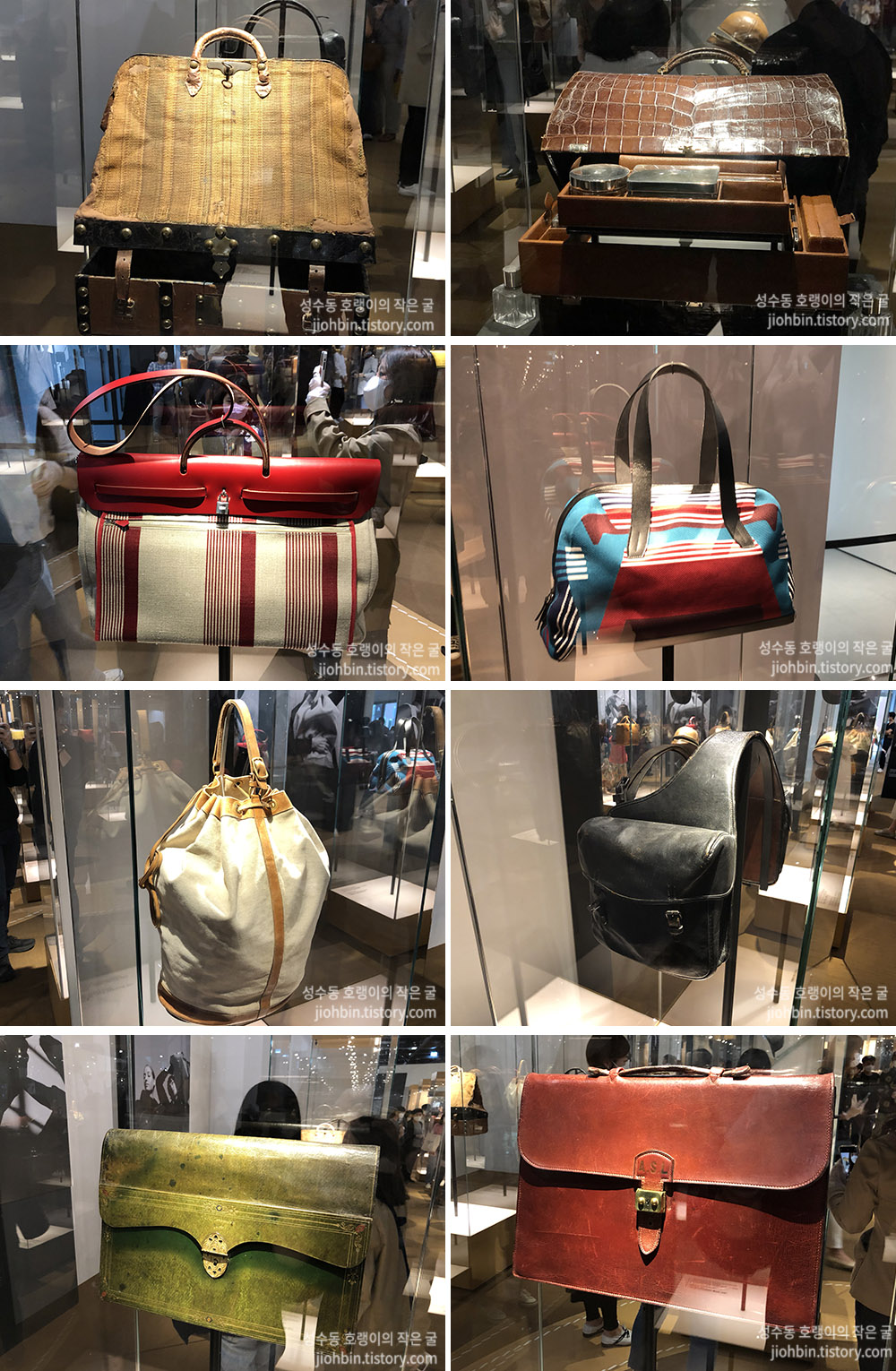 다양한 형태의 에르메스 백들이 보입니다. 최근에 발표된 제품부터 1840년경 제작된 오바나이트 백(가방 사진 중 제일 상단 좌측 세로 스트라이프의 오래된 가방 사진)까지 다양한 가방들을 보는 재미가 아주 쏠쏠합니다. 형태도 색감도 가죽의 표현, 디자인, 디테일의 구성까지 아주 풍부합니다. 말 위에 얹고 사용할 수 있는 '승마를 위한 새들백'(우측 사진 중 위에서 세 번째 사진)도 보입니다.