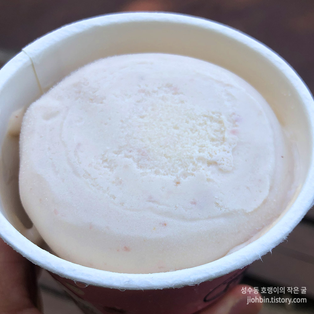 한입 먹어보니 아이스크림 질감은 좋았습니다. 소프트 아이스크림이나 젤라토처럼 사르르르 부드러운 것과는 거리가 멉니다. 아이스크림에 셔벗 느낌이 살짝 느껴지는 정도로 생각해주시면 될 것 같습니다. 개인적으로 나쁘지 않았습니다.