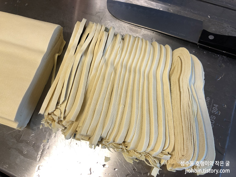 저는 조금 넓은 면이 좋아서 칼국수 정도보다 조금 얇은 두께로 썰었습니다. 이 사진만 두고보니 곱게 칼국수 면발을 썰어둔 사진 같기도 합니다. 포두부(건두부) 면을 더 얇게 썰고 싶다면 넓은 포를 한두 장씩 분리해서 돌돌 말아 잘게 썰어주면 됩니다. 이 방법은 다음에 한번 더 포스팅해볼까 합니다.