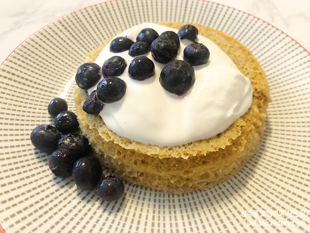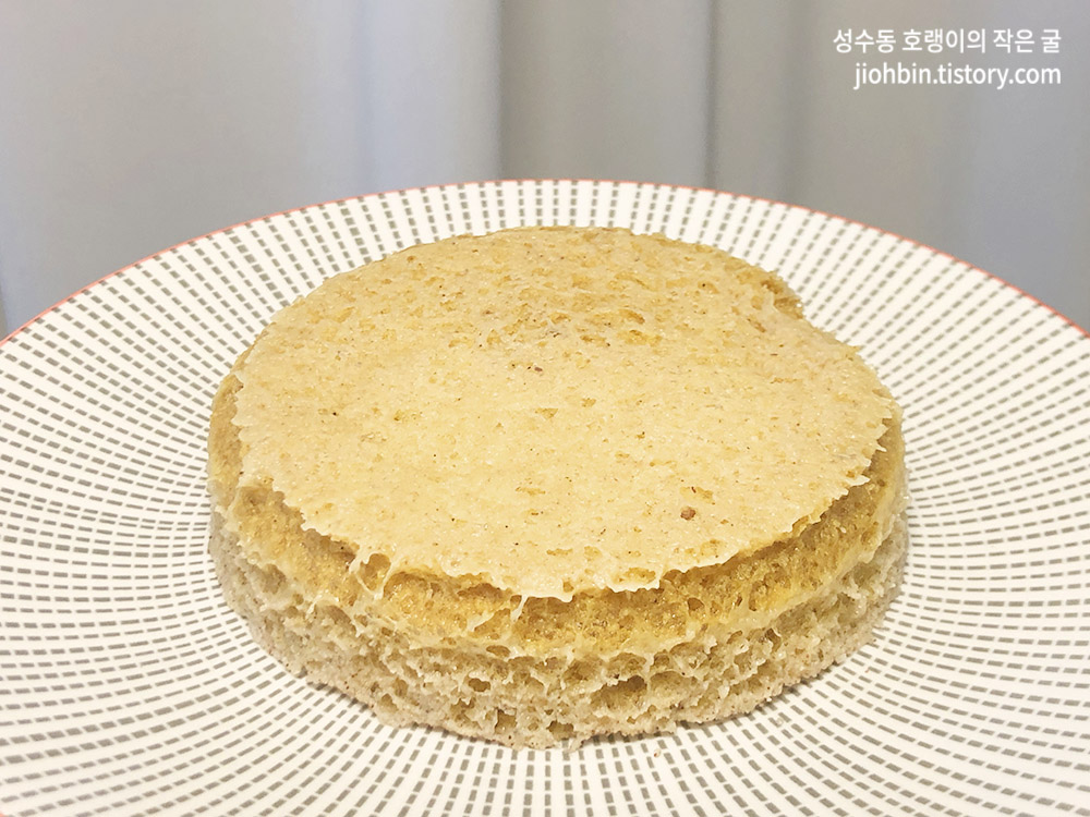 완성된 빵을 접시에 옮겨 뒤집어 담았습니다. 포슬포슬 합니다. 약간 전자레인지에 돌려서 완성해먹는 즉석 컵케익이 떠오르는 모습입니다.