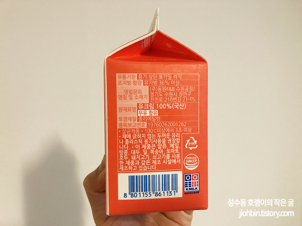 성분 좋습니다. 유크림 100%!! 아주 확실합니다. 다른 요소 없이 유크림으로만 만들어진 제품이라 마음에 쏙 듭니다. 그만큼 지방 함량도 높아서 저탄고지 식단에 아주 딱 맞습니다.