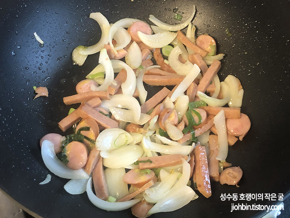 골고루 잘 볶아줍니다. 이때 소금 후추를 넣어 간을 맞춰줍니다. 햄과 소세지의 간도 있기때문에 약간은 과하지 않게 간을 잡아도 좋습니다.