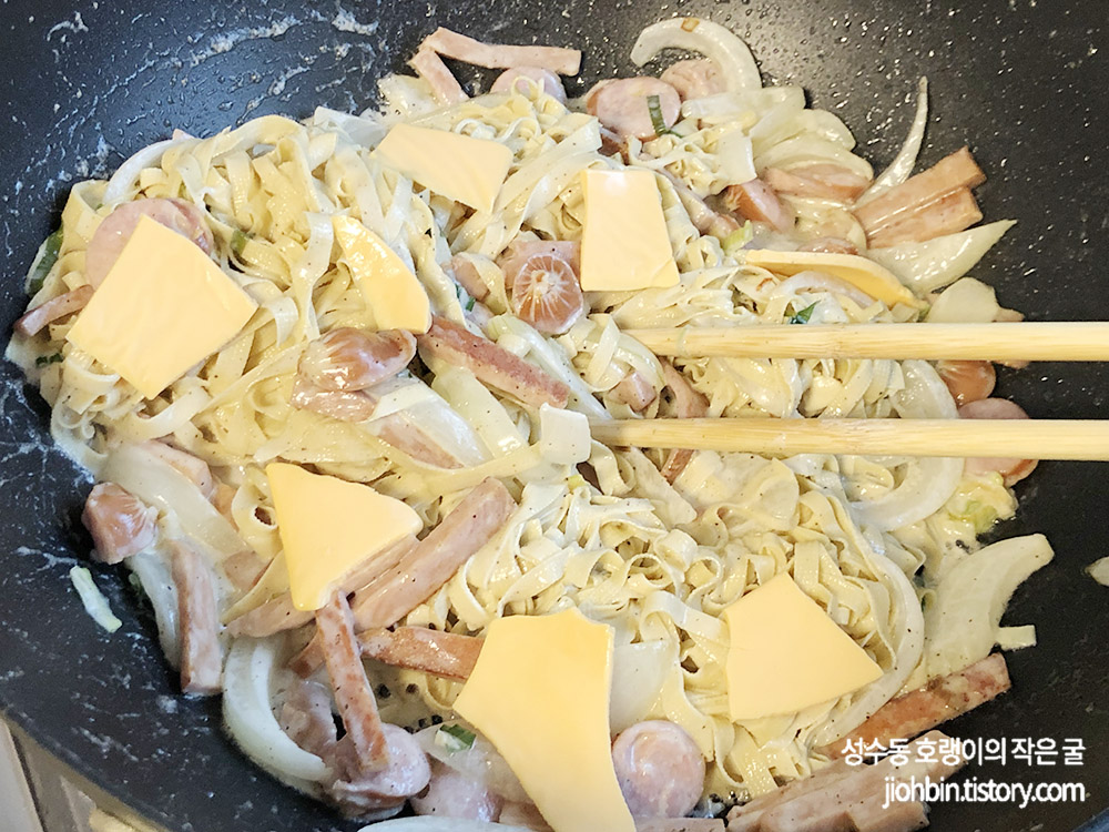 마무리로 체다치즈를 넣어 풍미를 올려봤습니다. 치즈덕후라서 꼬릿한 향도 살아난 맛이 좋고 더 깊어진 크림의 맛이 좋아 추가했습니다.