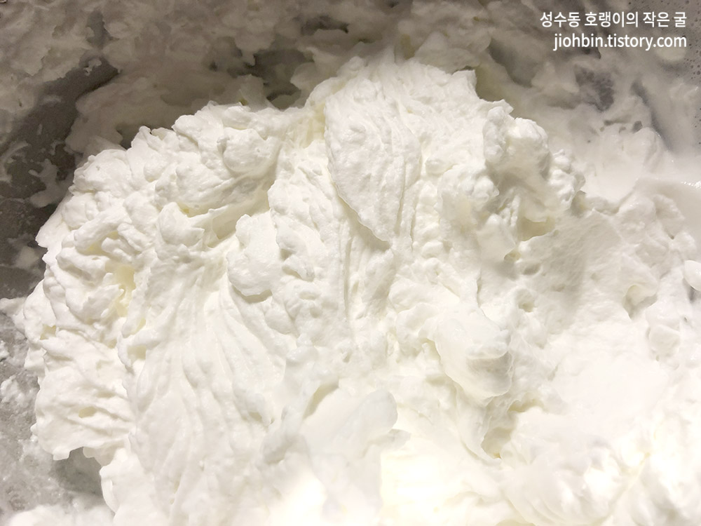 볼에 담긴 생크림을 케이크에 올라가는 크림 상태가 될 때까지 휘핑해줍니다. 제가 쓰는 거품기는 최고 파워로 돌려주면 2분 내외로 완성되는 듯합니다. 그릇에 비해 크림이 많을 경우 사방에 튈 수 있으므로 주의해주어야 합니다. 넉넉한 볼에 담고 휘핑해줘야 합니다.