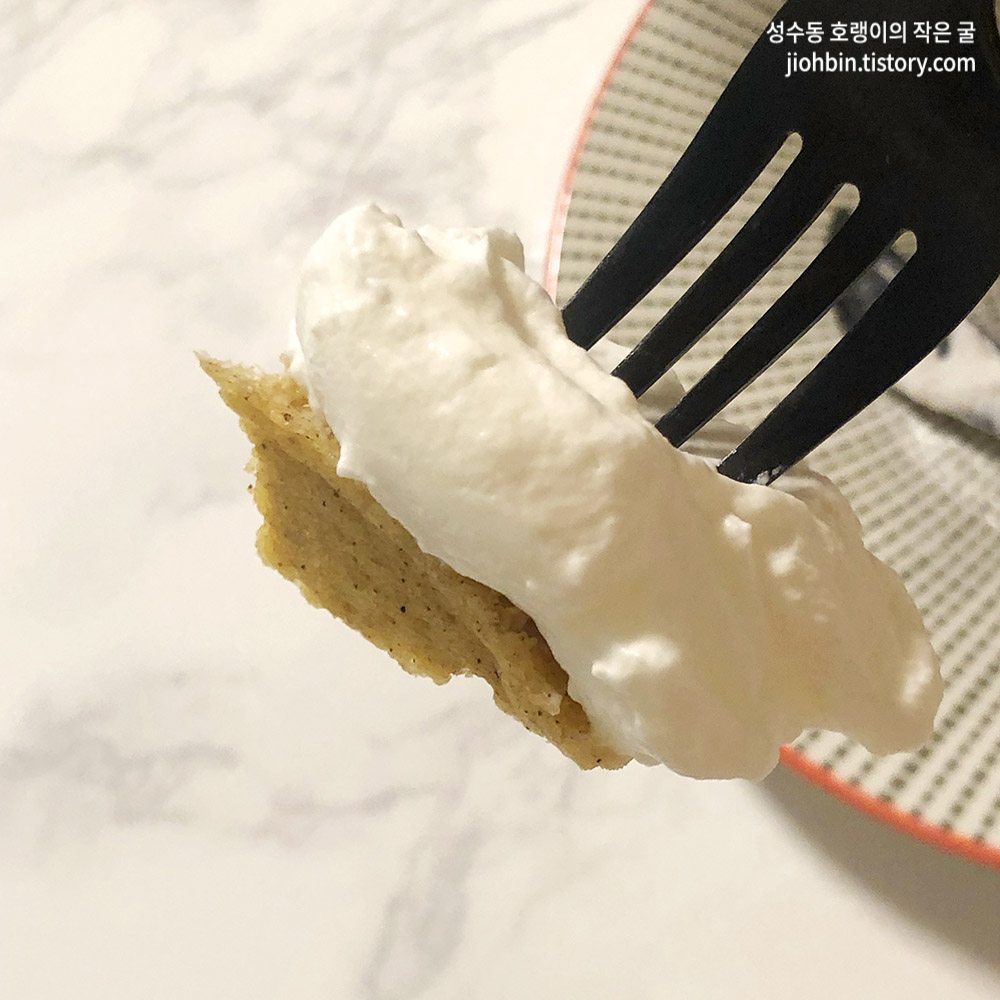 완성된 초간단 키토식 케이크의 단면입니다. 고소한 아몬드가루 90초빵과 시원 달달한 생크림의 조화가 아주 좋습니다. 나름 까다로운 디저트 쟁이인 짝꿍도 너무 맛있다며 순식간에 한 접시를 함께 해치웠습니다. 먹으면서도 딸기만 있었다면 아주 완벽한 생크림이 될 수 있었을 것 같아 조금 아쉬웠습니다. 이 아쉬움을 바탕으로 다음엔 꼭 딸기를 함께 사 와야겠습니다.