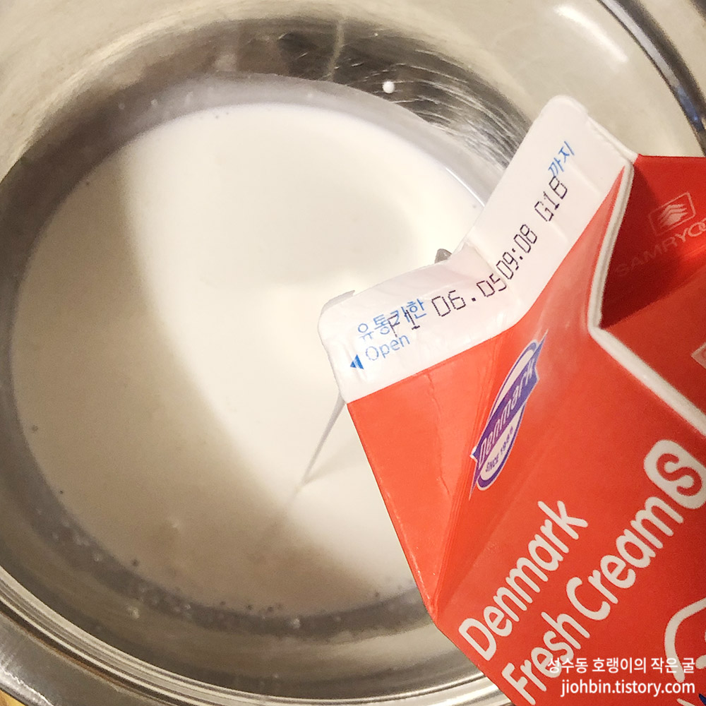 우선 깨끗하게 씻어서 말려둔 스테인리스 볼에 생크림을 넣어줍니다. 냉장 보관해서 시원한 생크림입니다.