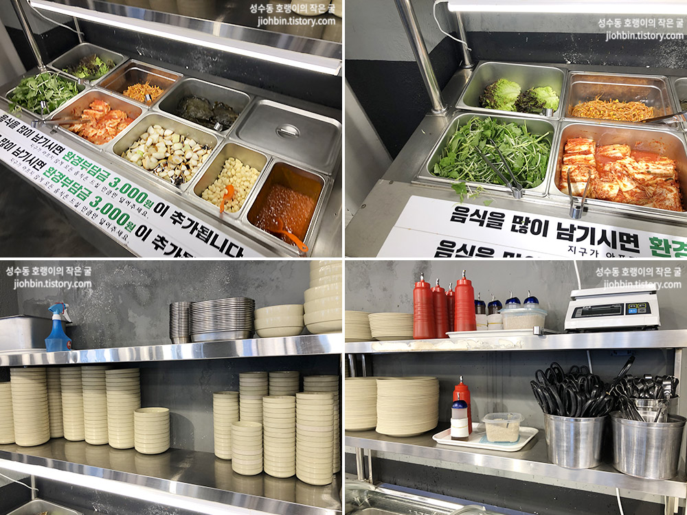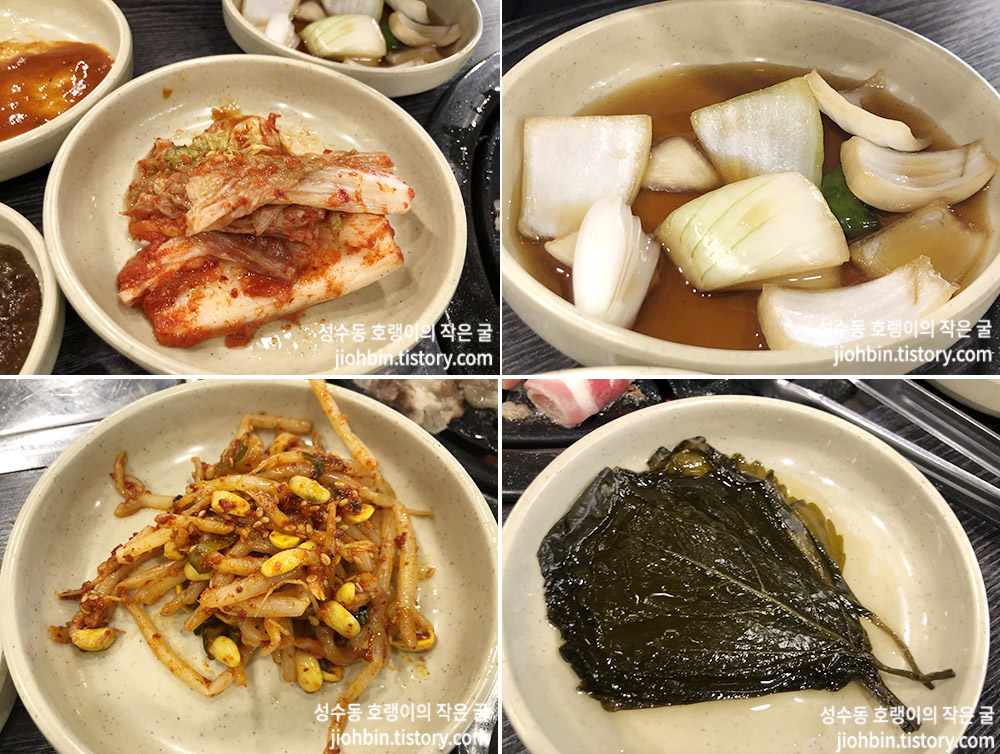 첫 기본 반찬은 세팅해 주셨습니다. 다만 이후부터는 직접 리필 바에서 원하는 만큼 담아서 먹는 시스템이었습니다. 시원한 김치와 양파 간장절임, 콩나물 무침, 깻잎절임이 나왔습니다. 여기에 참나물 파무침, 상추와 물티슈를 주셨습니다. 장류는 셀프바에서 가져다 먹는 듯했습니다. 기본적으로 소금 후추를 담아오고 빈 소스 그릇도 두어 개 챙겨 왔습니다.