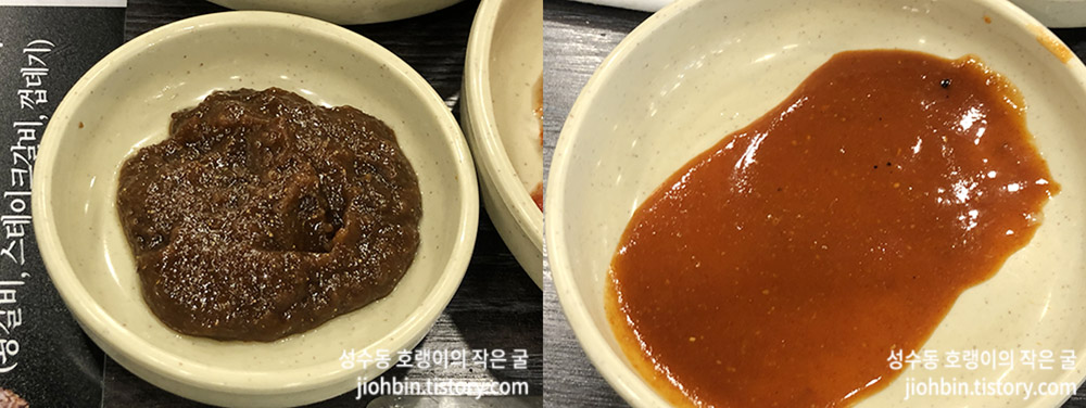 담아온 소스를 그릇에 옮겼습니다. 양념해 온 키토 쌈장은 작은 소스 그릇에, 파무침용 키토 초고추장은 넓은 앞접시에 옮겨 담았습니다. 이렇게 간단한 양념만 챙겨 와도 외식에서 설탕과 탄수화물의 걱정을 줄일 수 있습니다. 물론 이런 양념류 없이 소금과 후추만으로도 고기는 맛있긴 하지만, 이런 다양한 맛의 소스를 활용하면 고기를 더 많이 맛있게 먹을 수 있습니다.