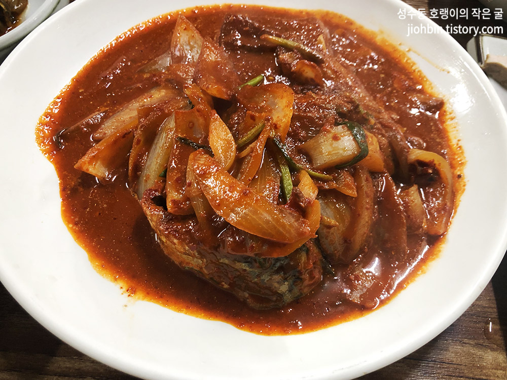 양념간장을 뿌린 두부와 볶은 묵은지, 파김치, 채소 겉절이, 해초무침이 기본 반찬입니다. 전반적으로 반찬들이 다 맛있습니다. 서울 음식처럼 아주 달지 않아서 더 좋았습니다.