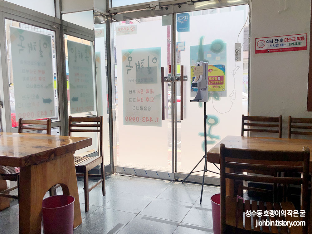 내부의 테이블과 의자에서부터 노포의 포스가 가득합니다. 입구에는 시국에 맞추어 체온 체크를 할 수 있는 체온계가 있습니다.