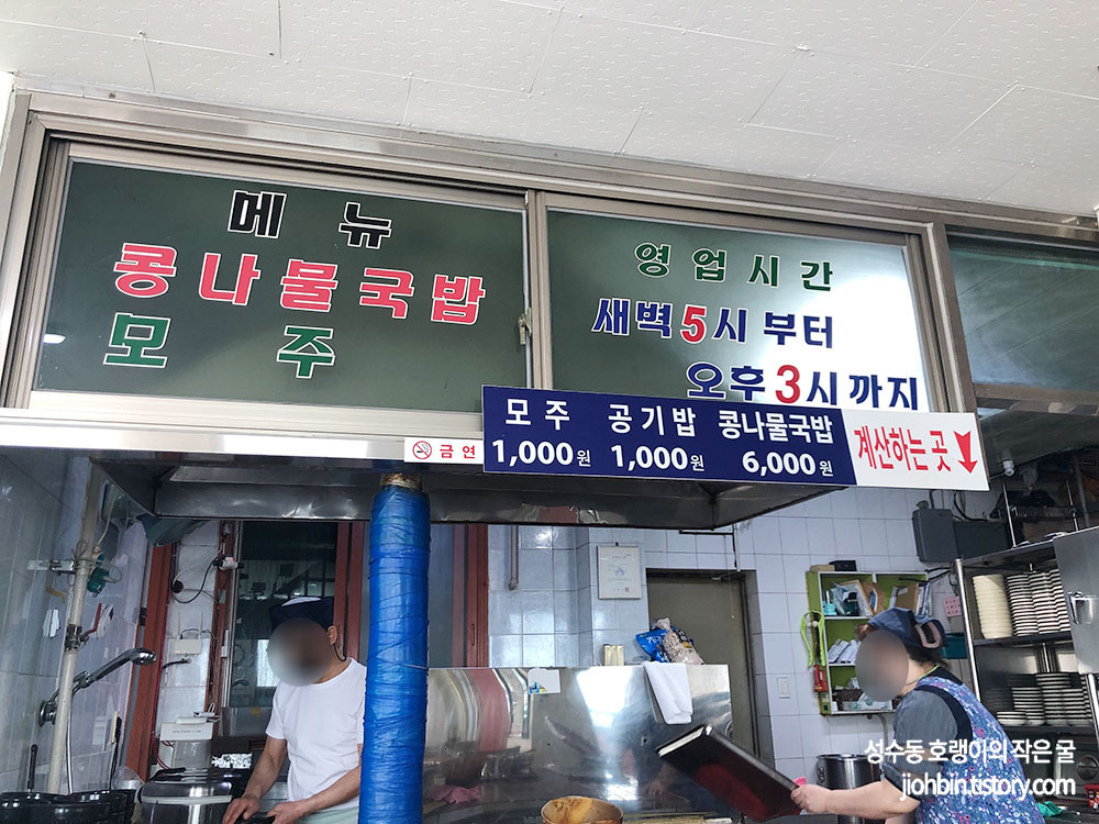 들어와 메뉴판을 찾으니 주방 위에 심플하게 정리되어 있습니다. 콩나물국밥 6,000원, 모주 1,000원, 공깃밥 1,000원 끝. 간결합니다. 콩나물국밥집에 무엇이 더 필요할까 싶습니다. 자리에서도 내부가 보이는 오픈형 주방이 아주 깔끔해 보입니다.